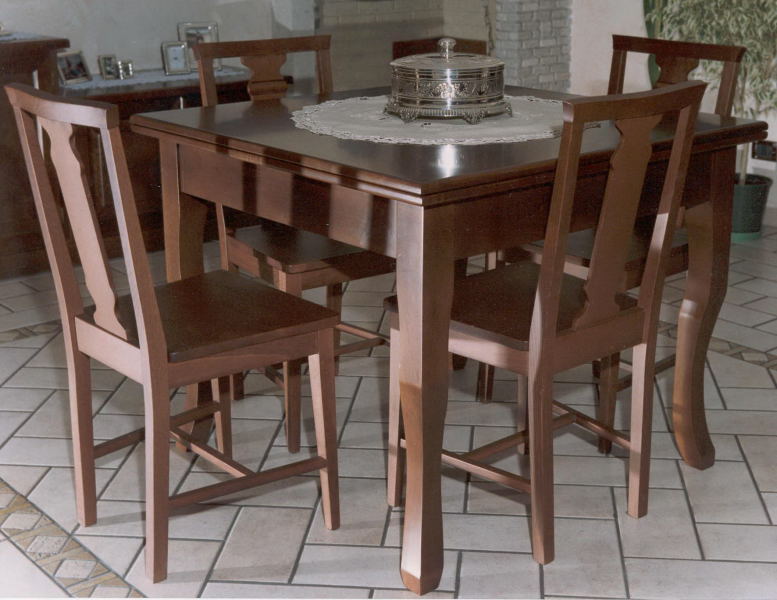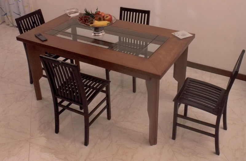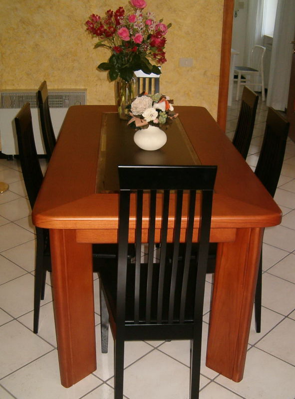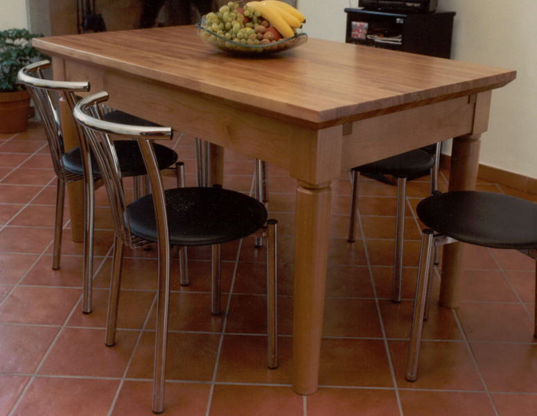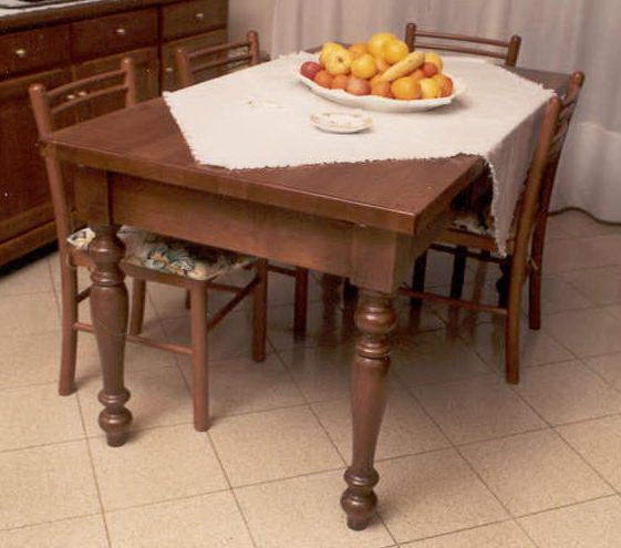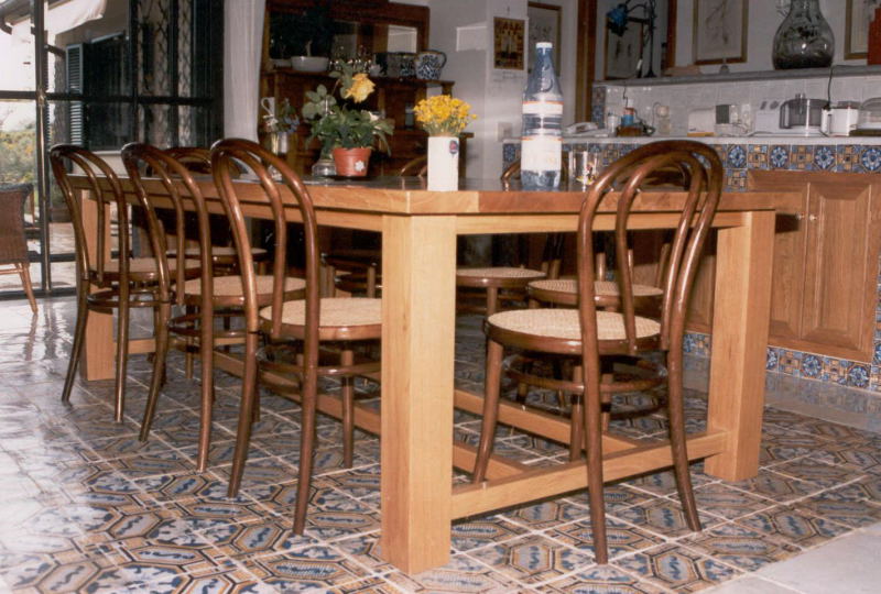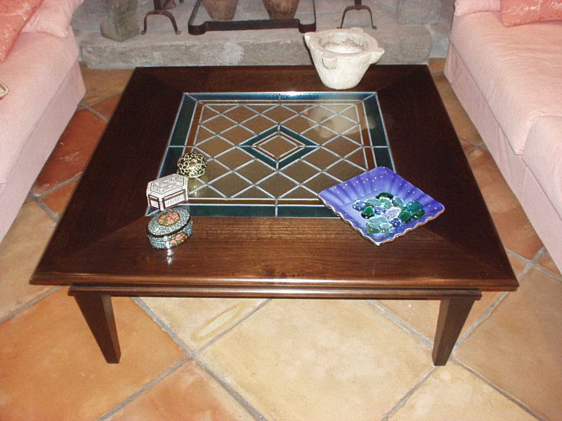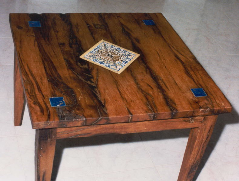 Tavolo realizzato con tavolame antico e piastrelle incassate.