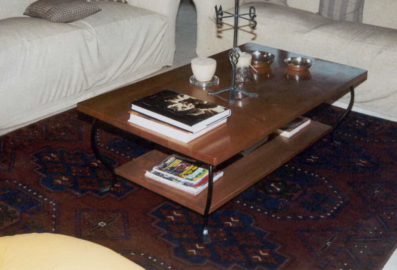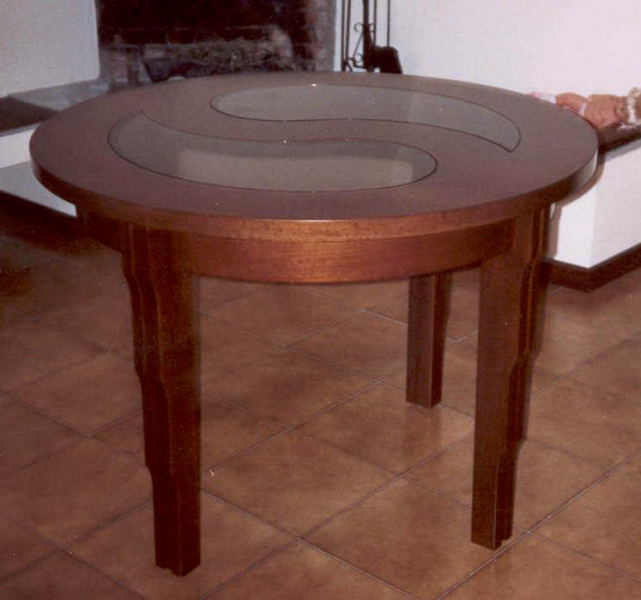 Tavolo basso da salotto in noce nazionale con vetro decorato.